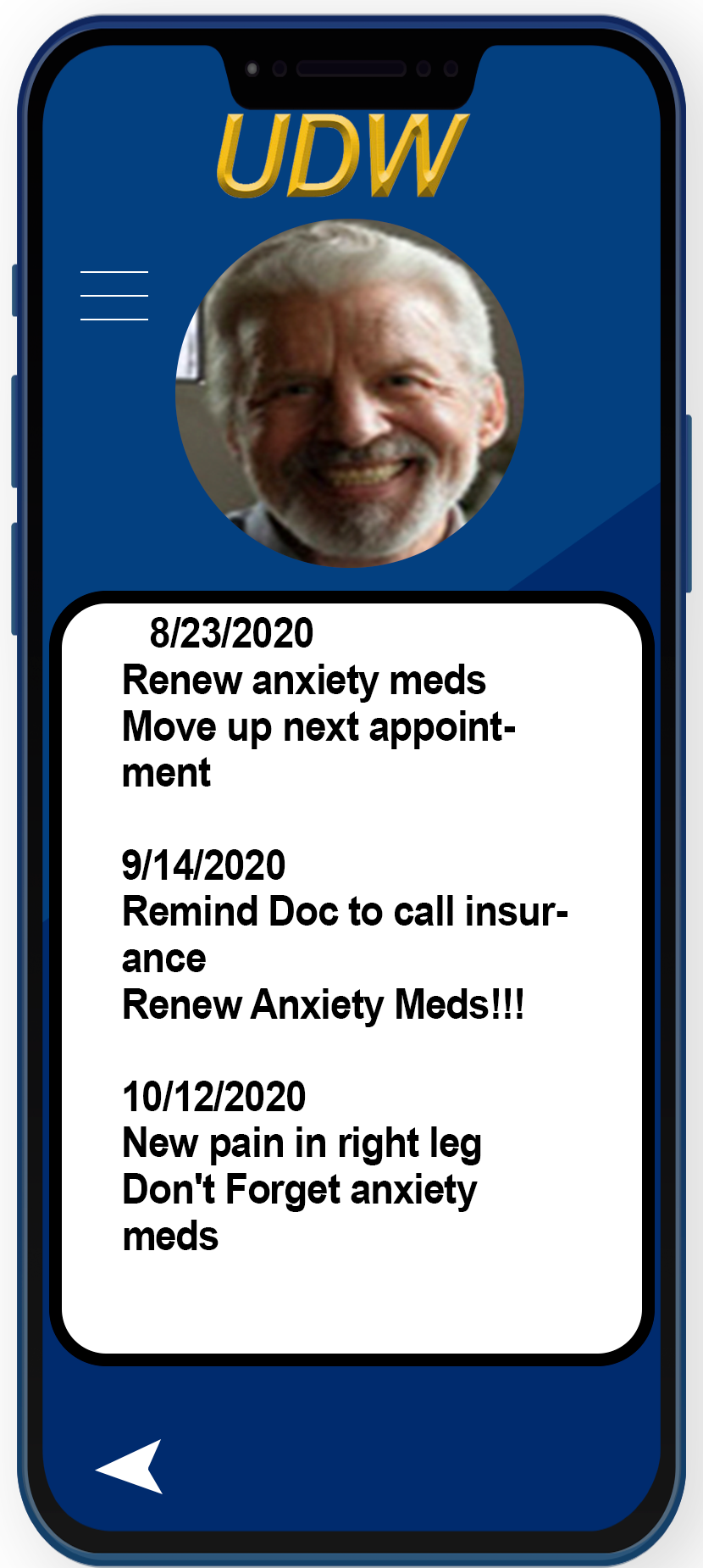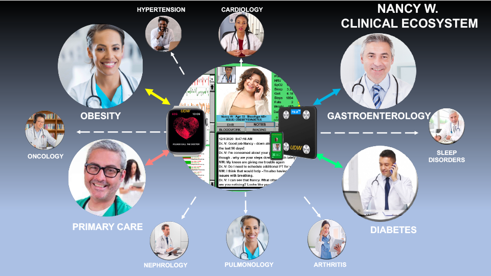 Nancy is a moderately obese 53 year-old Diabetic with hypertension and sleep disorder co-morbidities. She is being monitored for breast cancer based on family history, and her Primary Care Physician is also coordinating Nancy’s care through the UDW interface with her Nephrologist, Pulmonologist, and Cardiologist. This Provider Ecosystem is being served by Nancy’s UDW Watch and the UDW physician interface at a total cost of $50/month which will be fully paid by the insurer.