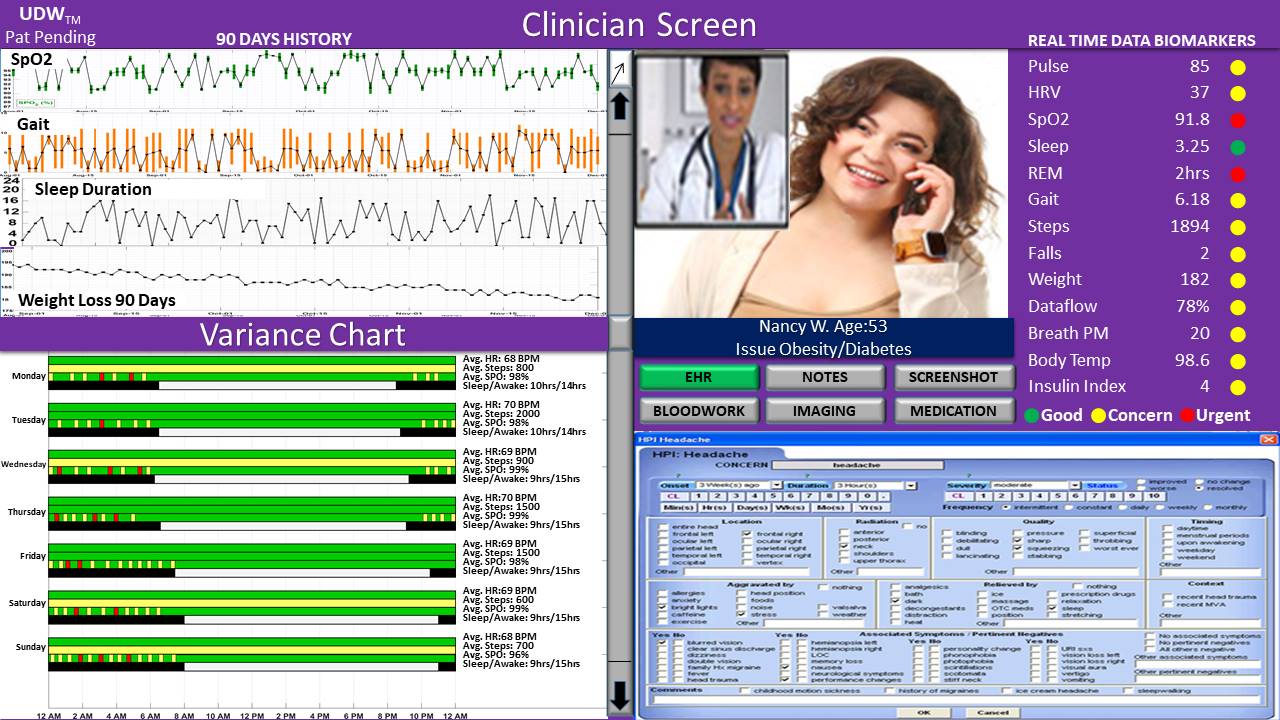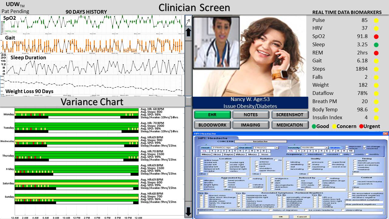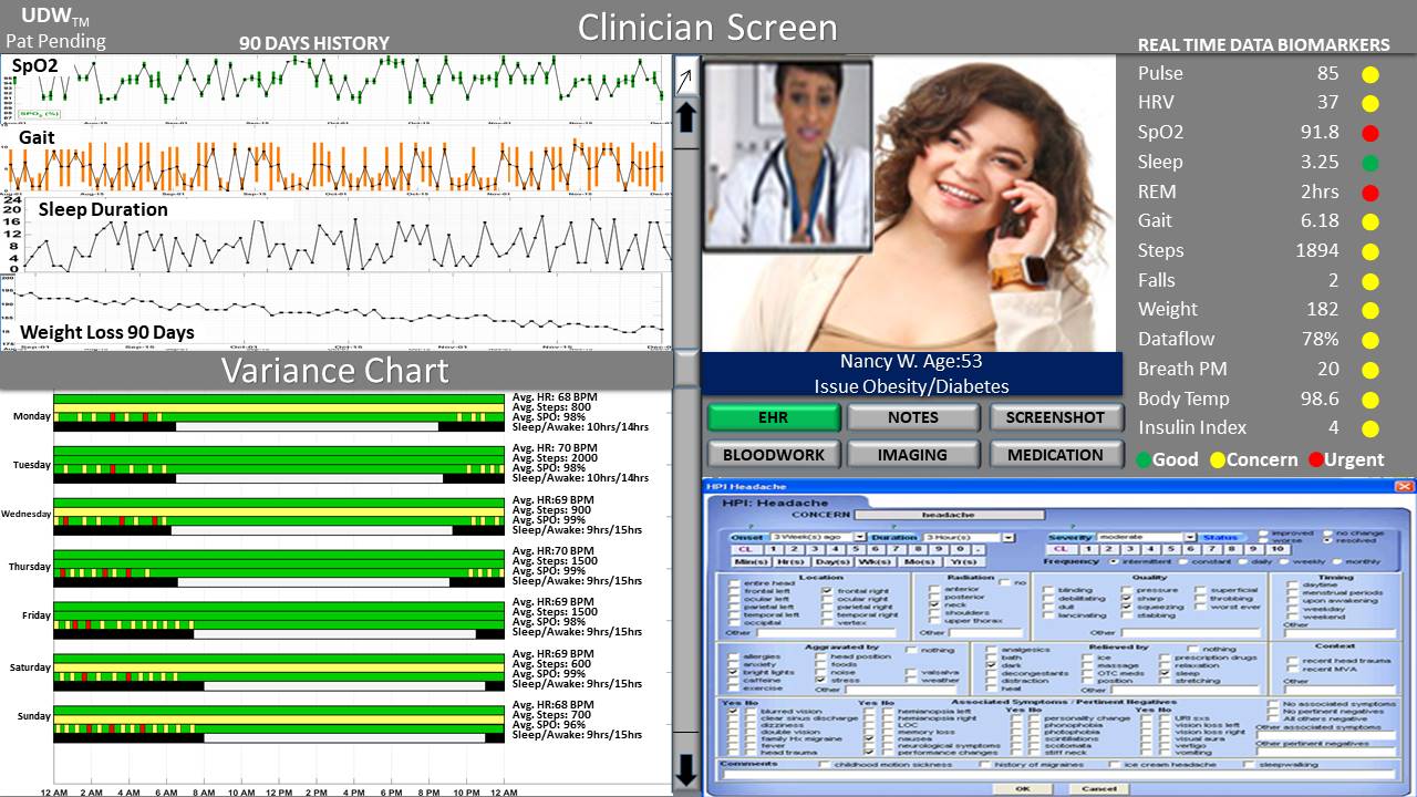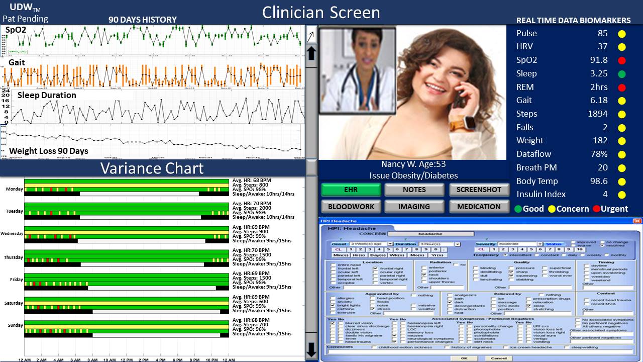 In addition to fully supporting non-critical interactions such as routine virtual and in-office exams/visits, the UDW system also offers “Just-In-Time Adaptive Intervention” capabilities dealing more effectively with critical clinical and behavioral events. Using both sensor and digital data to display dozens of selectable clinical and behavioral markers, UDW can detect and report a wide range of critical events and conditions affecting patient health such as medication levels, alcohol consumption, diabetes or obesity dietary relapse, the use of legal and illegal drugs, and other potentially critical and potentially life-threatening situations, conditions or events that would not otherwise be accessible to providers and clinicians.